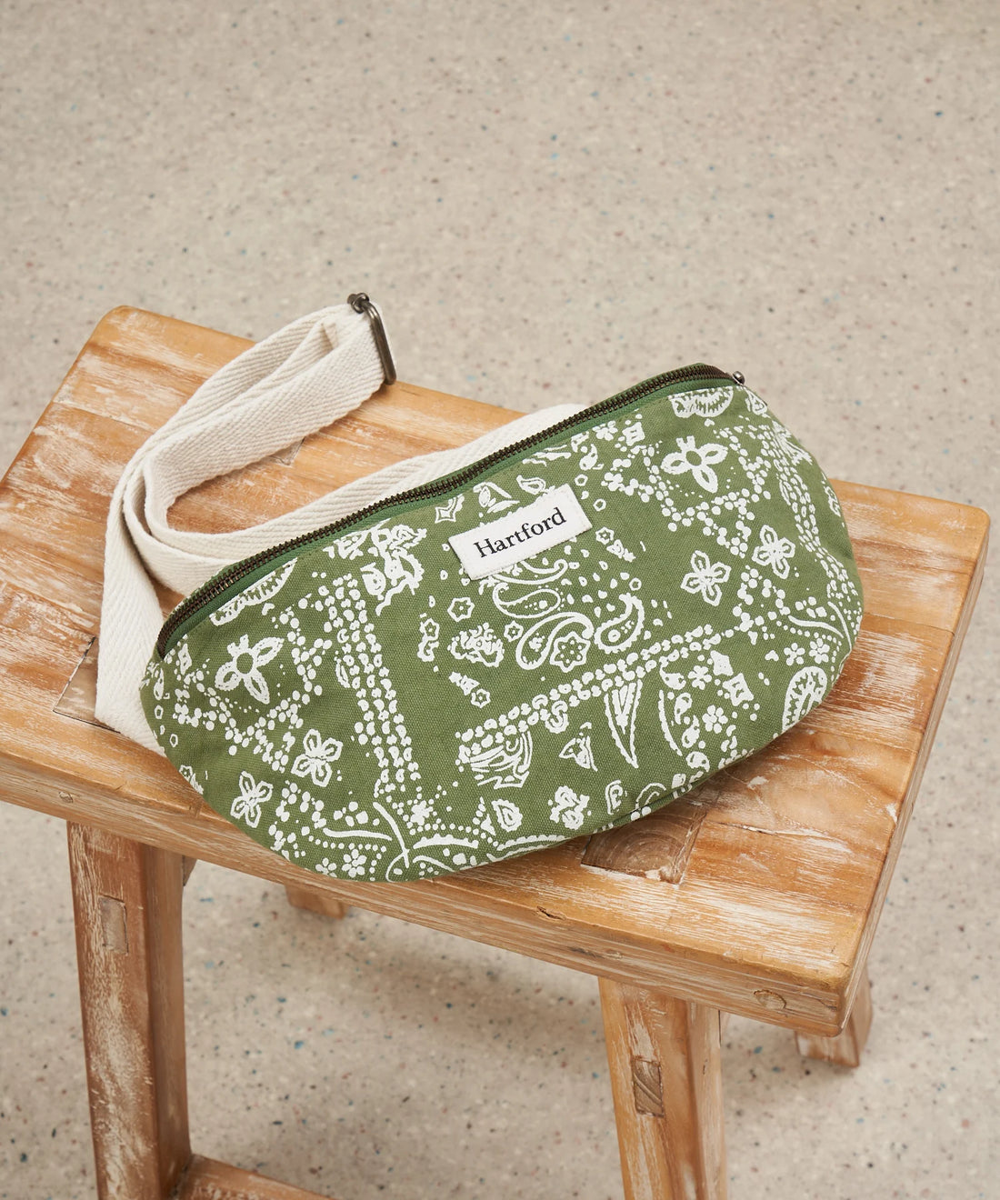 - Sac banane femme Etna en coton imprimé patchwork bandana avec étiquette écru Hartford sur le devant. Fermeture glissière et anse écru ajustable. A porter en bandoulière ou autour de la taille pour un style pratique et original. Dimensions : 18x32cm.